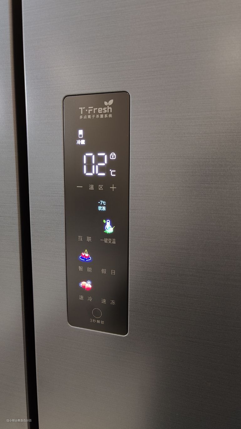 ▲下层右侧则为79L的-20°C~5°C宽幅变温室,可以在冷冻、冷藏等模式自由切换,从而根据不同的饮食习惯调整。用户可以通过冰箱右侧冷藏室门上的彩色触摸屏便可对包括宽幅变温室在内的3个舱室进行温度调节,不仅可进行精准到1°C的手动调节,还有等几种预设温度可进行一键设定。