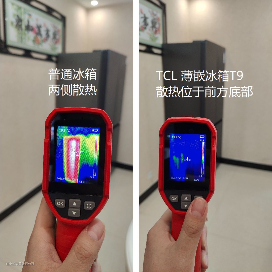 ▲如热成像图所示,普通冰箱将散热部分设置在了冰箱的左右两侧,因此在摆放时,左右两侧必须要留出约10cm的空间以供散热,否则会导致冰箱散热不良,严重影响制冷效果与冰箱的寿命。