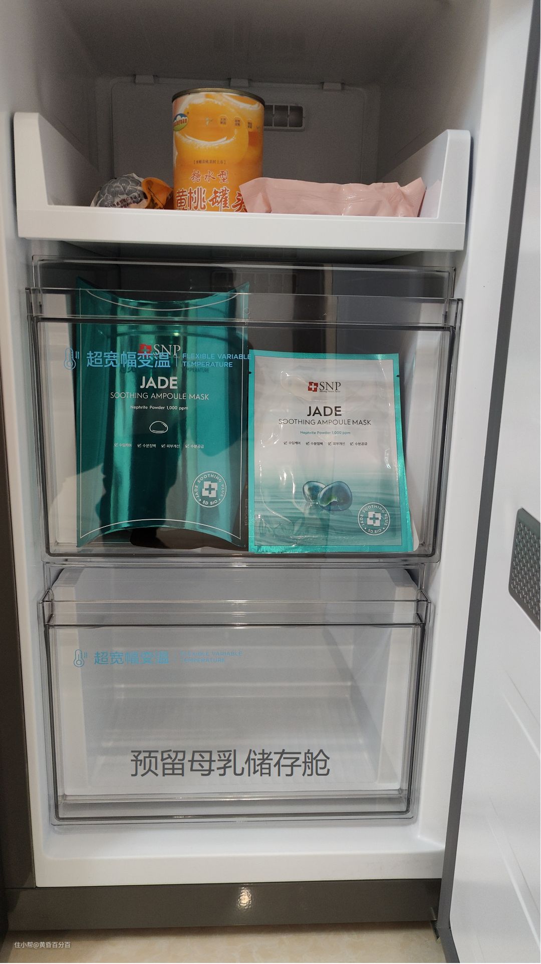 ▲宽幅变温室与冷冻室的抽屉均都是透明的,内藏食物一目了然,取拿十分方便,目前,我将宽幅变温室设定为了4°C,其中上层抽屉用于存放我家女王的面膜等护肤品,下层抽屉则为预留的母婴舱,用于存放母乳,这里简单说一句:母乳中的DHA在4°C时保存最好,所以我将变温室的温度设为此温度,不过我家女王和宝宝目前回岳母家了,所以下层抽屉才空着。而面膜的护肤品的最佳保存温度也恰好是4°C,放在另一个抽屉里正合适,你说巧不巧,整个宽幅变温室就像是给我家那对母子准备的一样。