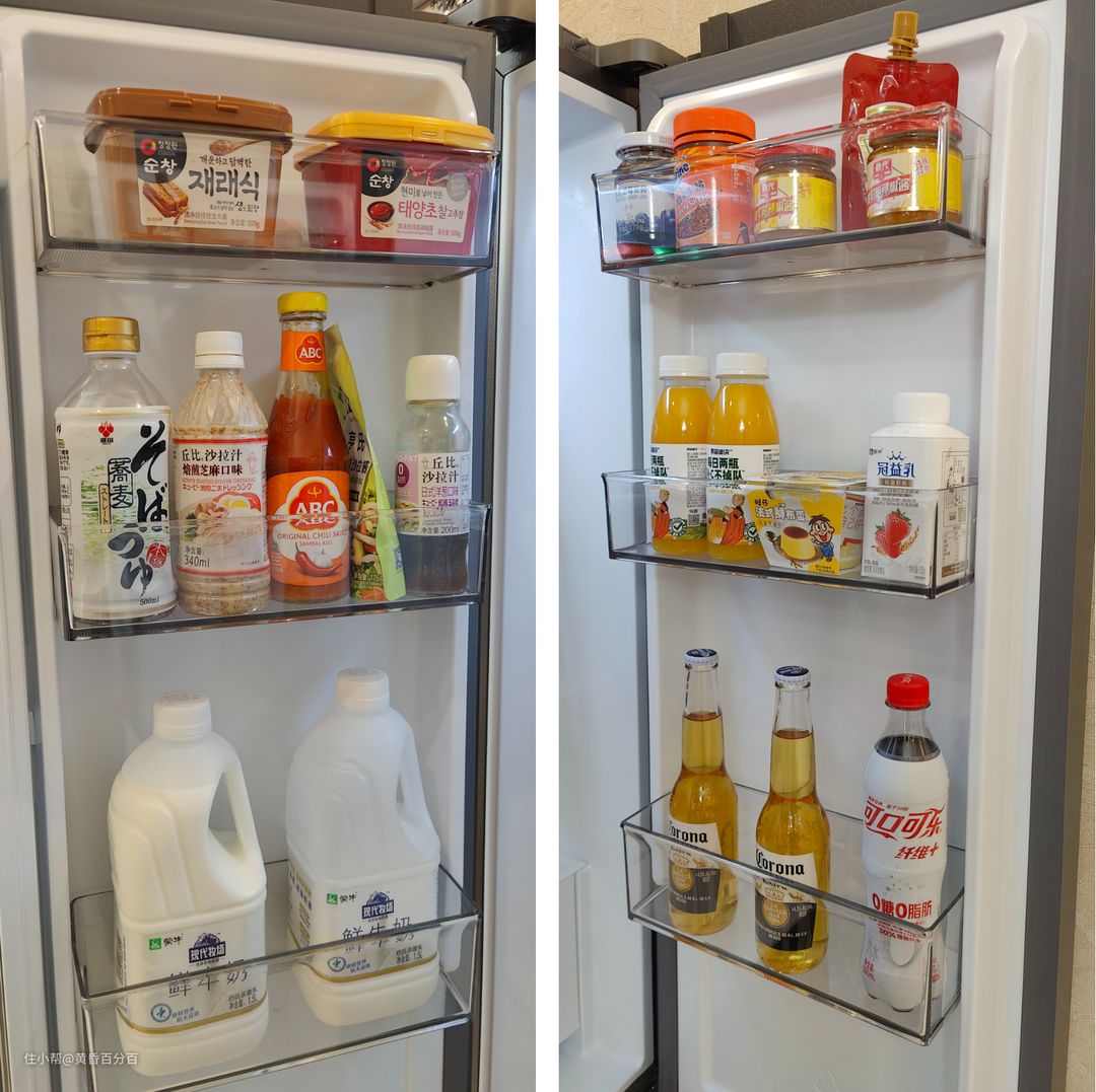 ▲冰箱冷藏室左右两侧的门上均有三组抽屉,其中上面两层适合放一些酱料与小瓶饮料,而大桶的牛奶与瓶装啤酒等则可放在下层抽屉中。