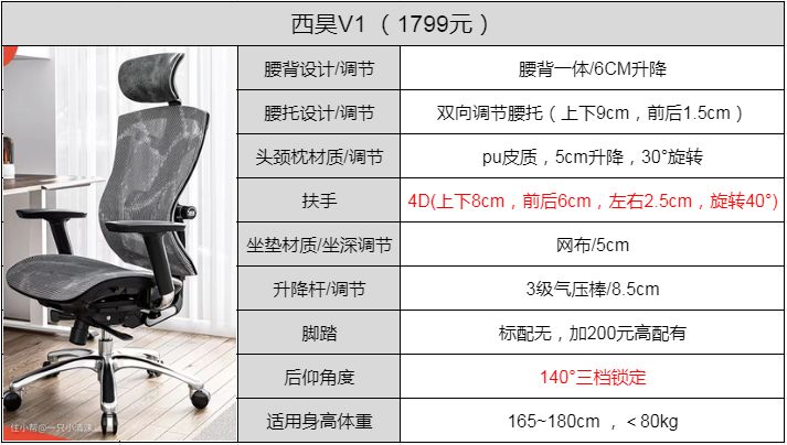 西昊V1高配除了腰托, 其他部位有关健康舒适度,以及身高体重需注意的参数我也列了对比表,结合表大家能更清晰理解我对几把椅子的感受;