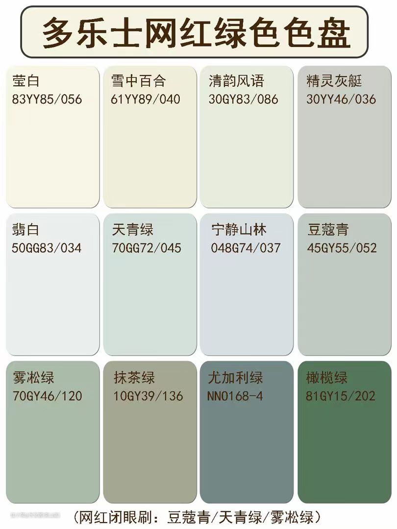 浅绿色小清新,墨绿色复古,深浅不同,效果各异。特正宗的雾凇绿,饱和度低很养眼,豆蔻青很有春天树叶的气息,做背景墙很小清新。