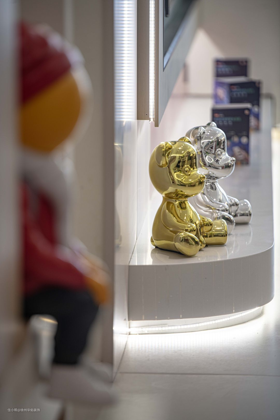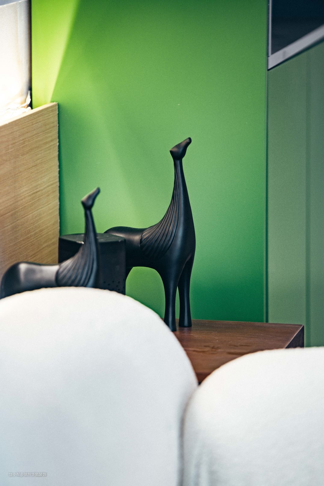 一侧定制嵌入式通顶收纳格,中部结合开放展示格,穿插清新活力的绿色、温馨粉色,呼应空间主题,保证空间的完整性,装饰摆件增添文艺气息。