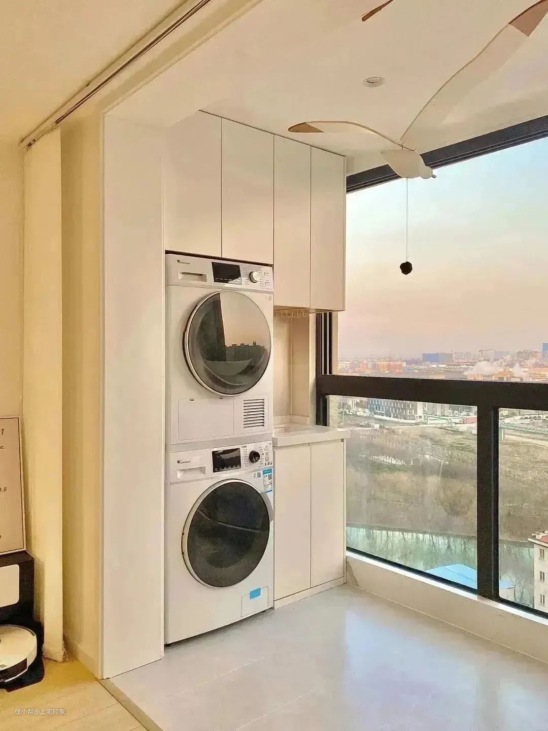 如果阳台需要设计洗衣区域,洗衣机插座和下水口必须装在水槽柜后面,不然洗衣机前面会凸出来。