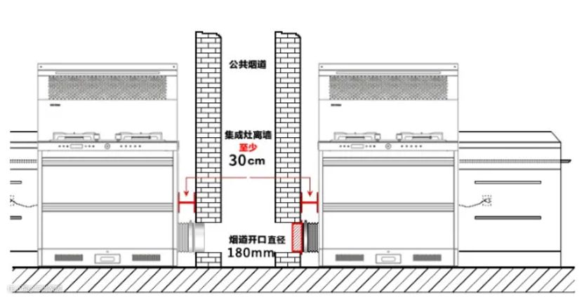 1.集成灶与烟道之间是以排烟管相连,排烟管最大长度为1.6cm,集成灶距离公共烟道最佳距离应在20cm~160cm范围内,距离小于10cm的话,集成灶无法安装;烟道距离排烟风道低于20cm时对于安装烟管和止逆阀不太方便。