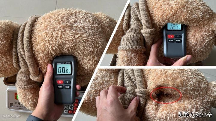 头部、脚步、肚子外面都是干的,湿度测试仪读数为0,不过熊的肚子里(有个空间可以放暖手宝)实测湿度为12.3%,手摸上去是潮潮的。
