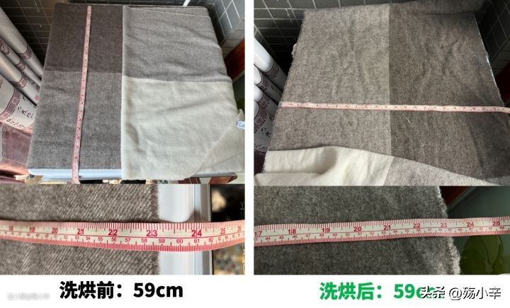 洗烘前后纯羊毛围巾宽度无变化,均为59cm~