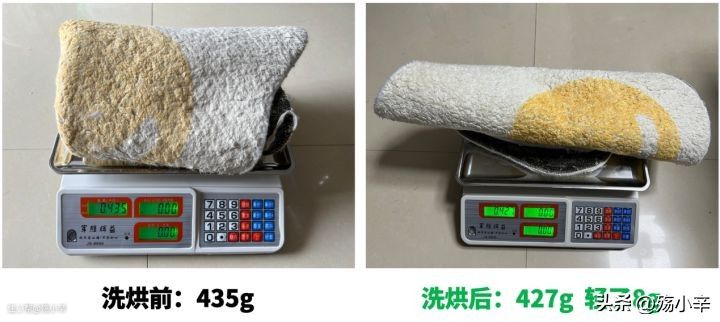 小地毯,洗烘前435g,洗烘后427g,轻了8g,我很满意~