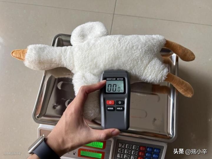 这只大鹅玩偶,洗烘前107g,洗烘后109g,重了2g