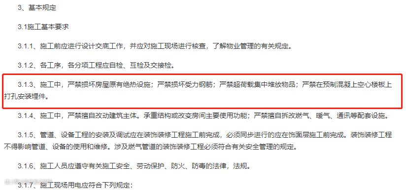 3.1.3、施工中,严禁损坏房屋原有绝热设施;严禁损坏受力钢筋;严禁超荷载集中堆放物品;严禁在预制混凝上空心楼板上打孔安装埋件。