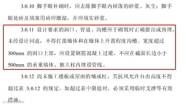 3.0.11条规定:“未经设计同意,不得打凿墙体和在墙体上开凿水平沟槽”。