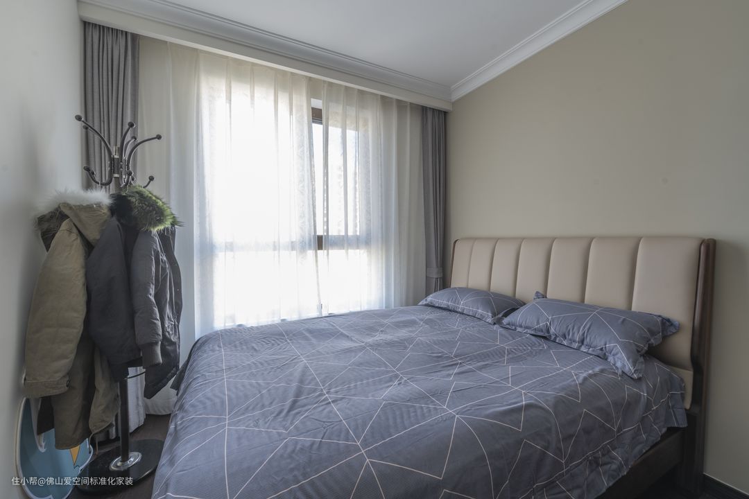 房间的窗户朝南,夏季温度偏高,所以选择了布帘+纱帘的双层窗帘。