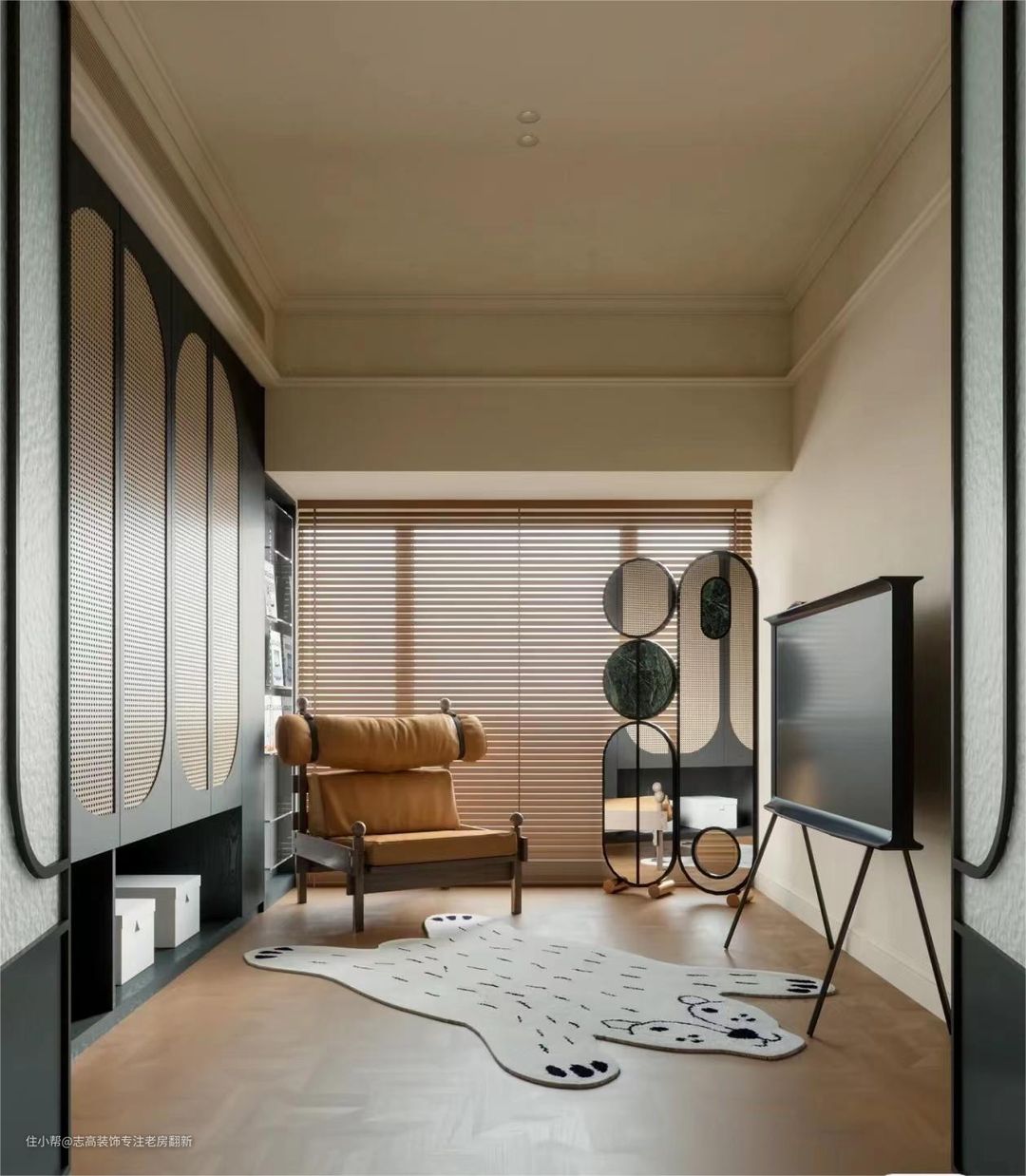 家具选择胡桃木色的实木家具,棕色、黑色或焦糖色的沙发,再搭配部分的黑色家具,提升空间的整个层次感。