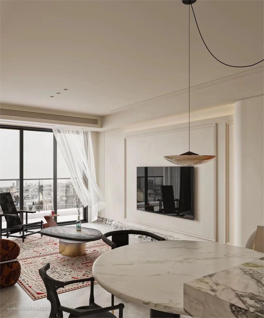 电视墙喜欢传统简洁的布局,就石膏线、电视墙、满刷全屋同色的乳胶漆。喜欢法式元素多一些的可以做壁炉,电视落地摆放这种布局的手法。