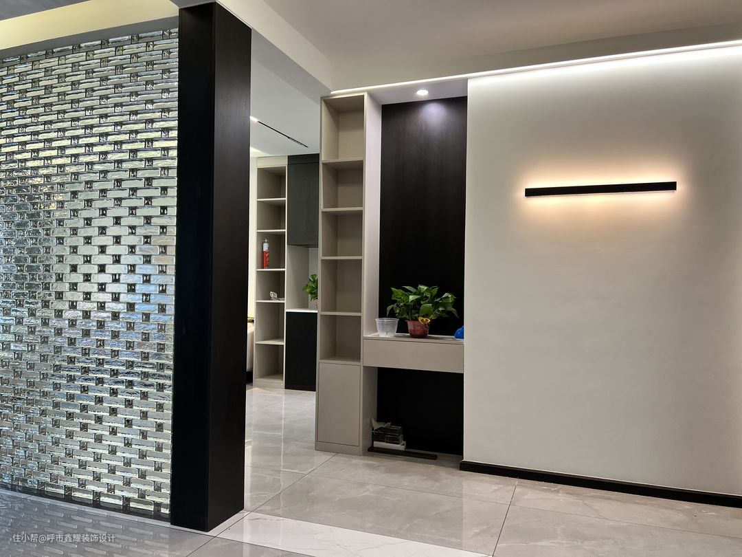 设计师选用现代风格家居的空间,用跳跃的色彩。玻璃水晶砖的运用,大胆而灵活,不单单是对现代风格家居的遵循,也是个性的展示。黑与白,是既对立又统一的关系。他们的组合给视觉带来一种极强的冲击感。白色,轻盈但寡淡,有了黑色的加入,立即让空间有了承托。