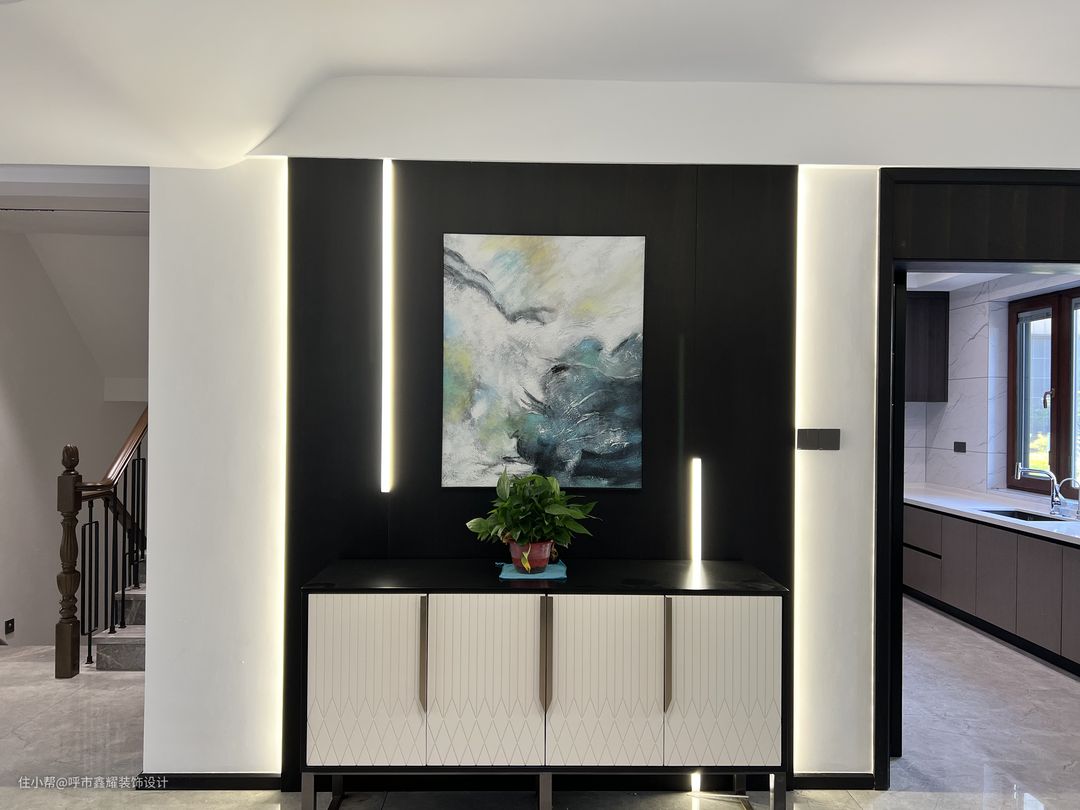 入户玄关将设计是与室内之间的一个过渡空间,对于户外产生了一定的视觉屏障,不至于屋内被一览无余,人们把它看作是家的第一道风景。墙面使用了黑白色对比手法,整个造型很简洁,线条也流畅,它没有太多的装饰,就是因为简简单单,人们才更加喜欢这样的设计。