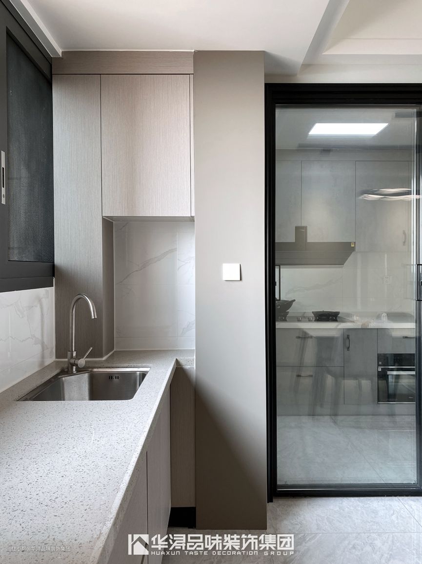 2. 厨房侧面的门洞扩大,延伸台面同时打造底柜进行收纳,厨房门更换为透明玻璃移门,台面打造嵌入式壁龛,丰富空间的多元属性。