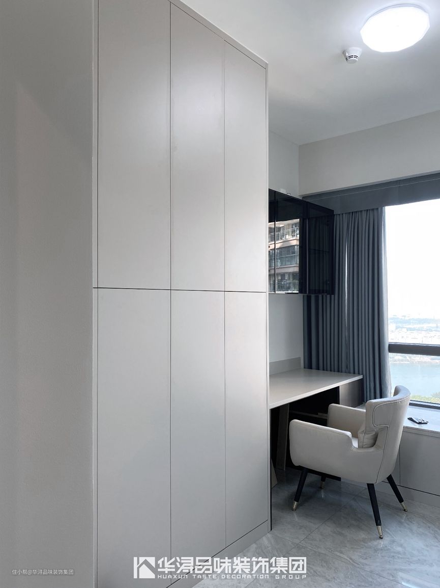 浅灰与岩板的搭配,营造出稳重而内敛的居住调性,通过书桌+储物柜的机构组合,将多种功能需求整合为一体。书桌靠近玻璃窗摆放,方便将户外的绿意与阳光纳入室内。纯净的色系和线条恰到好处的糅合,让低饱和度的空间营造出舒适恬静的美。