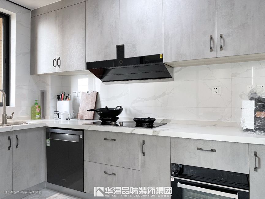 厨房虽然没有做完全的开放式设计,但依靠透明玻璃推拉门,使整个功能区毫无遮挡。厨房外侧的衔接区域靠窗打造多功能岛台+壁龛,不仅延展了操作台面,还拓宽了储物空间。台下侧做收纳底柜,放置日常不用的大件物品,俨然成为女主人最爱的收纳休闲区。