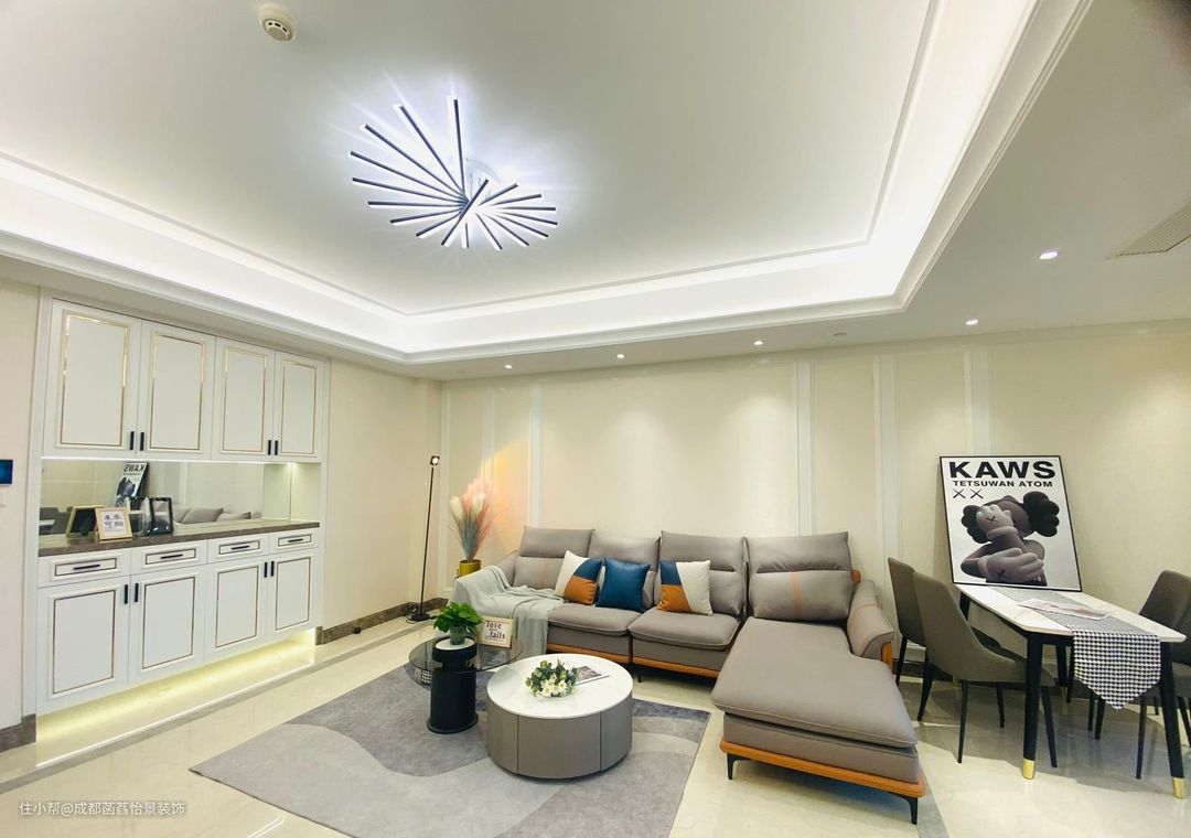 客厅做的双眼皮吊顶加灯带设计,个性吊灯提升氛围。L型沙发搭配高低茶几,简约又耐看。电视背景墙没有做复杂的造型,简约的矮柜,既增加收纳, 又提升空间整洁度。