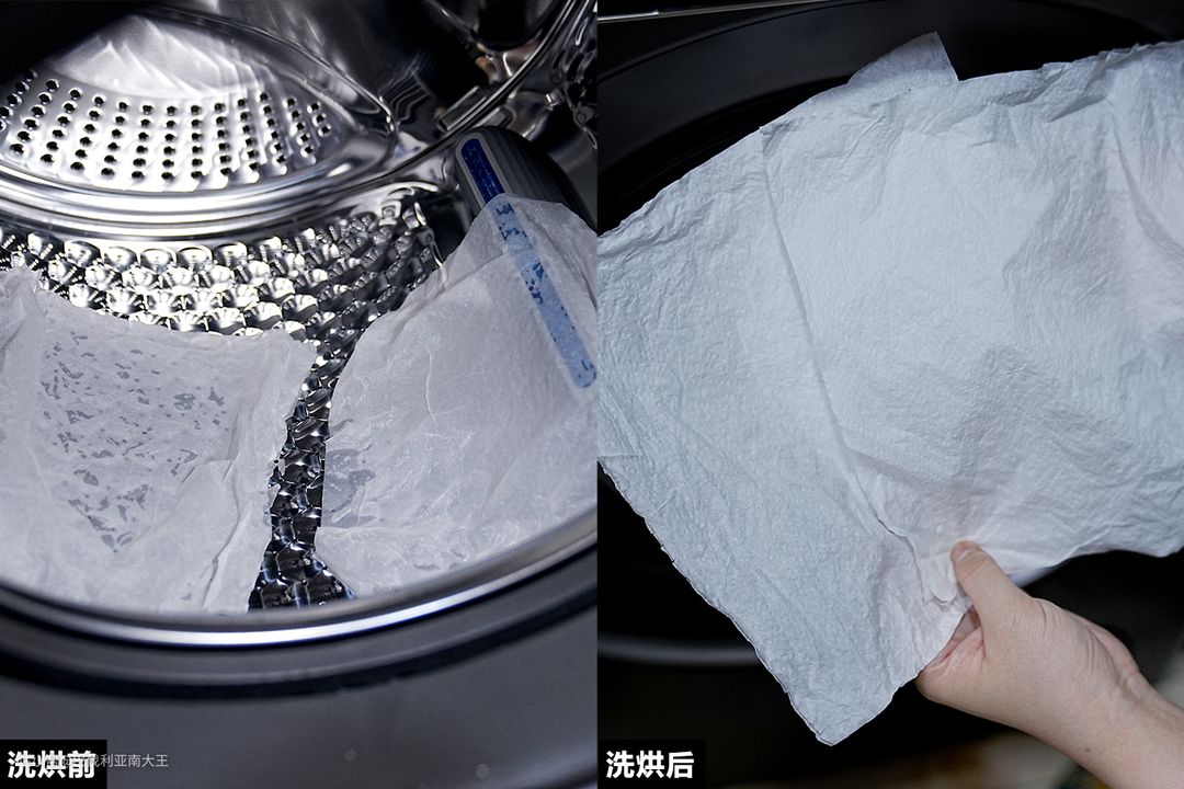 图中是我用纸巾做的极端测试,轻如薄翼的纸巾,在被水流打湿、清洗、烘干一连串的操作下,完好无损。足以见得分子筛烘干护衣的效果:洗不烂、烘的透。