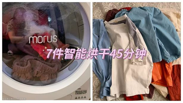 这款木卫小型烘干机的耗时是真的短。像平时这样要着急穿的衣服我都会用它救急。临出门发现有单件衣服忘了洗,赶紧快速把脏的地方揉一揉扔进烘干机,在闪烘模式下15分钟就搞定可以穿了,而且不烫手也不潮,穿起来非常亲肤。