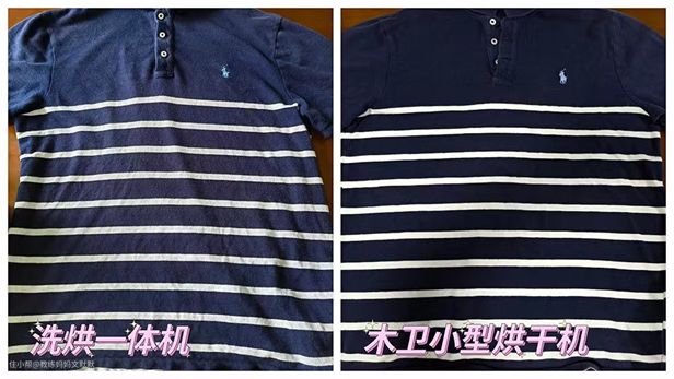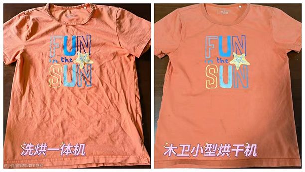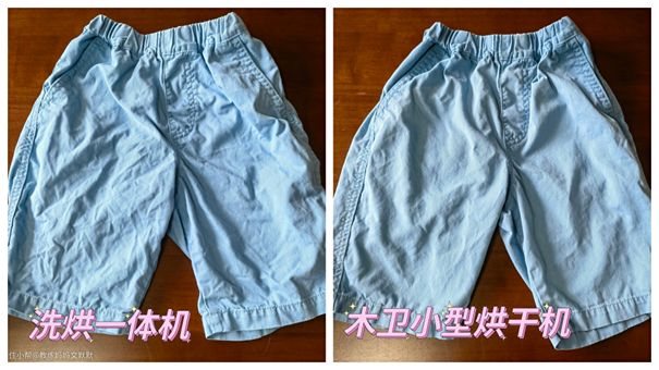 上图是我把洗烘一体机设置了洗15分钟,烘干45分钟;木卫小型烘干机用智能模式设置了45分钟对比下来的结果,看图就知道,木卫小型烘干机烘出来的衣服明显要更平整。连我们那条最容易起皱的纯棉短裤,看着都顺眼很多。而洗烘一体机是单向翻转,衣服就容易搅在一起不容易干,褶皱也更明显。