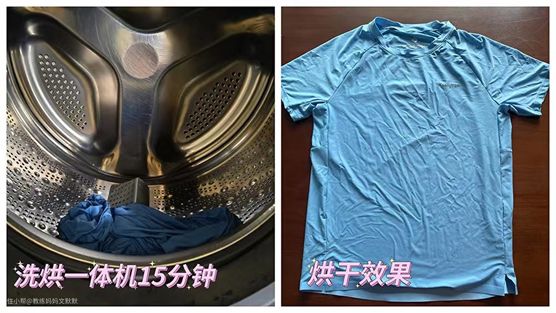 而同样用洗烘一体机,每一项根据面料材质,都有固定的烘干时间。一般都是1小时起步,最少的智能洗烘也要45分钟。如果着急穿,同样烘个15分钟打开舱门,出来的衣服不但潮潮的,而且还皱巴的厉害。需要晾晒后下才能穿。