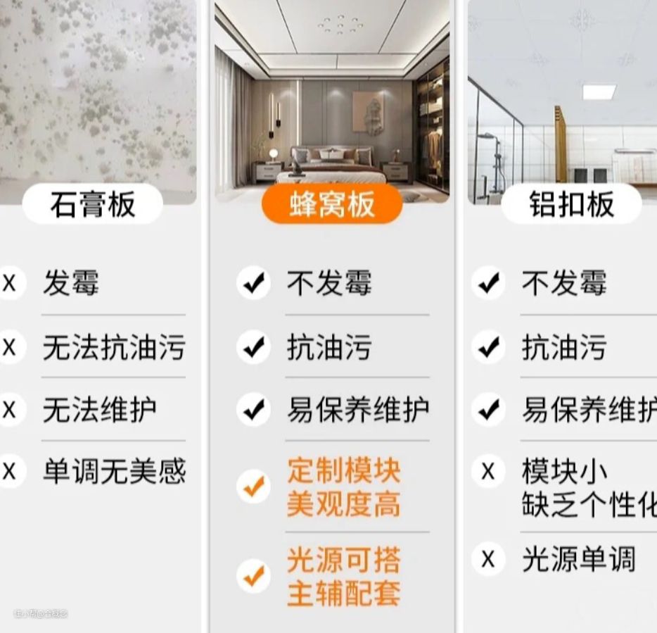 石膏板堪比花瓶,好看无用,受潮之后容易发霉;蜂窝大板好是好,如果你家厨卫本来就不大,预算有限就没啥必要,不会影响整体质量,检修的时候还不方便(空间大、预算充足可选)。