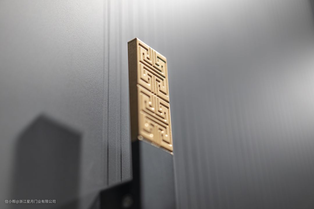 门扇的颜色采用了时尚的灰色调,搭配顶天立地的长把手,大气非凡~把手上下两端镶金色如意祥纹,犹如一抹光,突出了时尚轻奢的风格,作为入户门寓意非常好,万福吉祥~