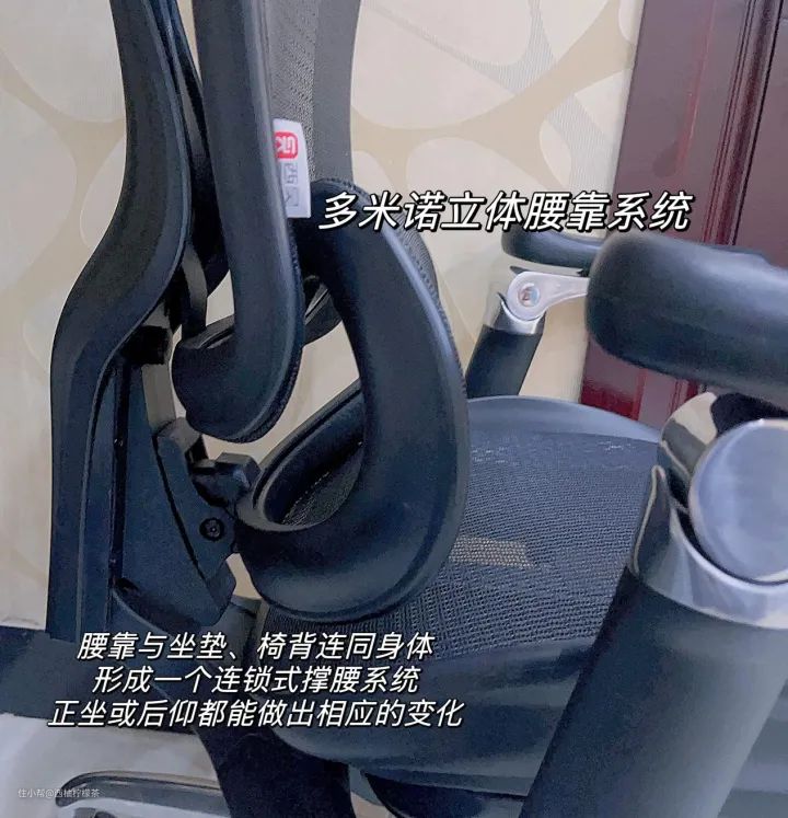 多米诺腰靠系统把腰靠与坐垫、椅背和身体形成了一个连锁式的系统,不管是正坐还是后仰时,这套系统不用手动调节腰靠,能做出相应的变化,解决了市面上很多单背式或多背式的椅背,在骶骨位置经常没有支撑,导致悬空的问题,这个技术才是真正做到久坐不累的原因所在。