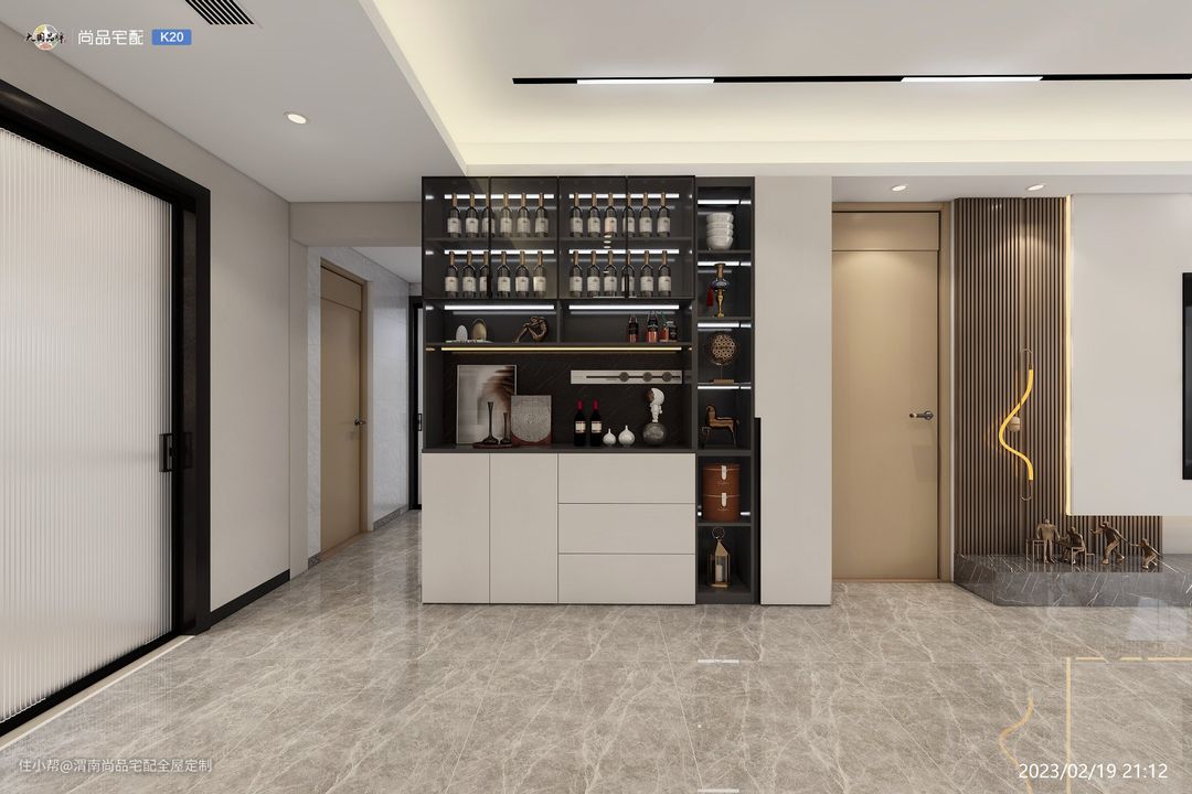 餐边柜的设计,包含封闭式玻璃酒柜、开放式展示柜以及收纳柜,既满足了不同的收纳需求,还展现出空间的温和与清新感。简单的配色,让空间显得十分整洁。