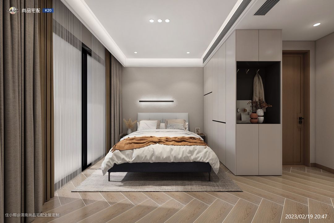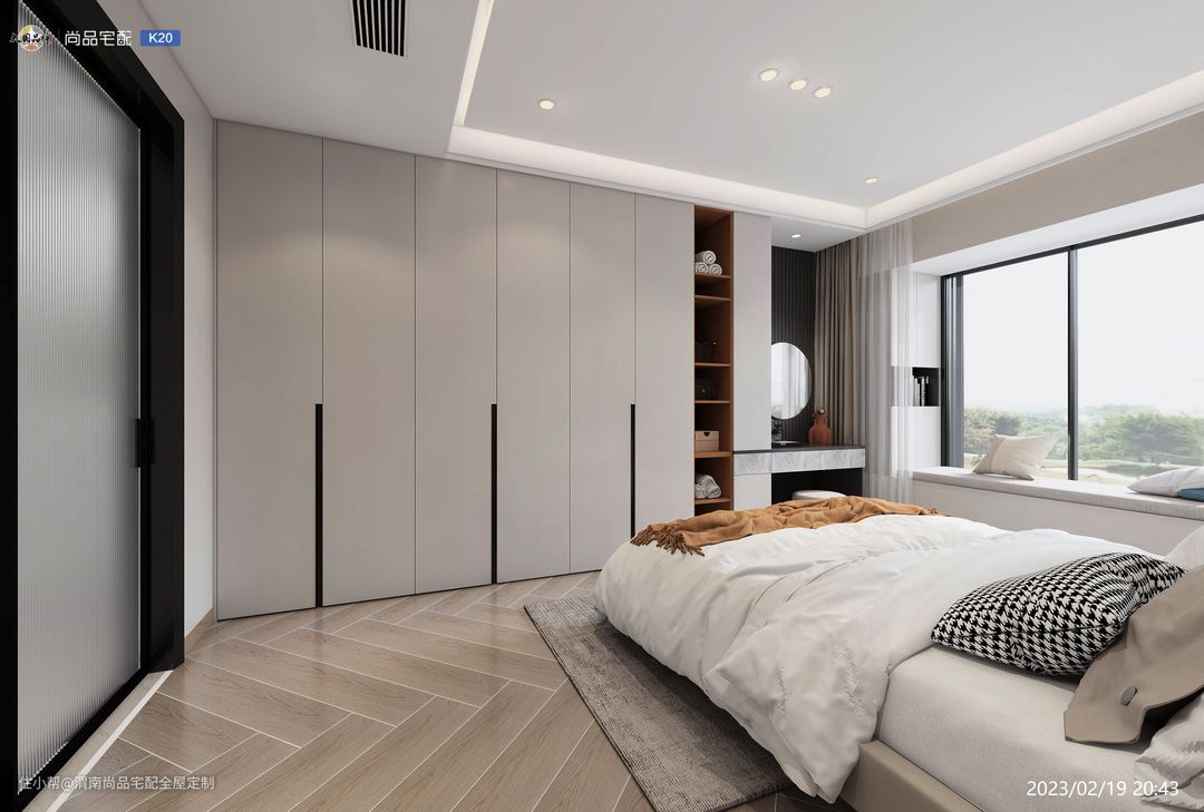 床尾处,整面墙定制顶天立地衣柜,搭配开放式小格挡以及悬浮式梳妆台,既显示空间的高级感,又提供更多日常收纳需求。