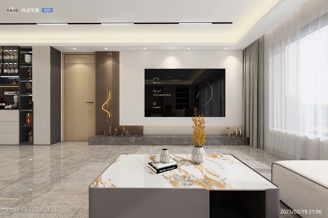 电视背景墙采用有质感的奶白色,硬包格栅线条,和嵌入的灯条以光线呼应,电视下方大理石材质的台面上摆放些许的艺术品进行点缀,带来更丰富的视觉展现。