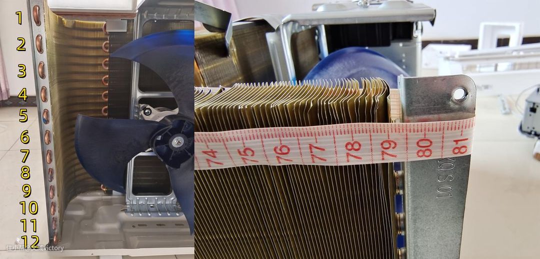酷省电空调外机蒸发器是1.6排铜管、铜管直径7mm,12组共计48根铜管。
