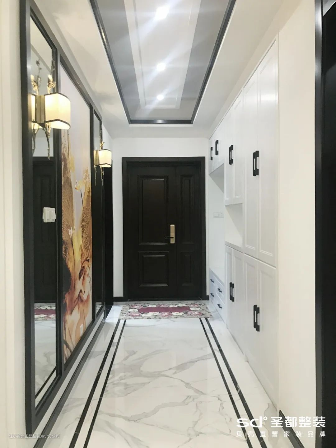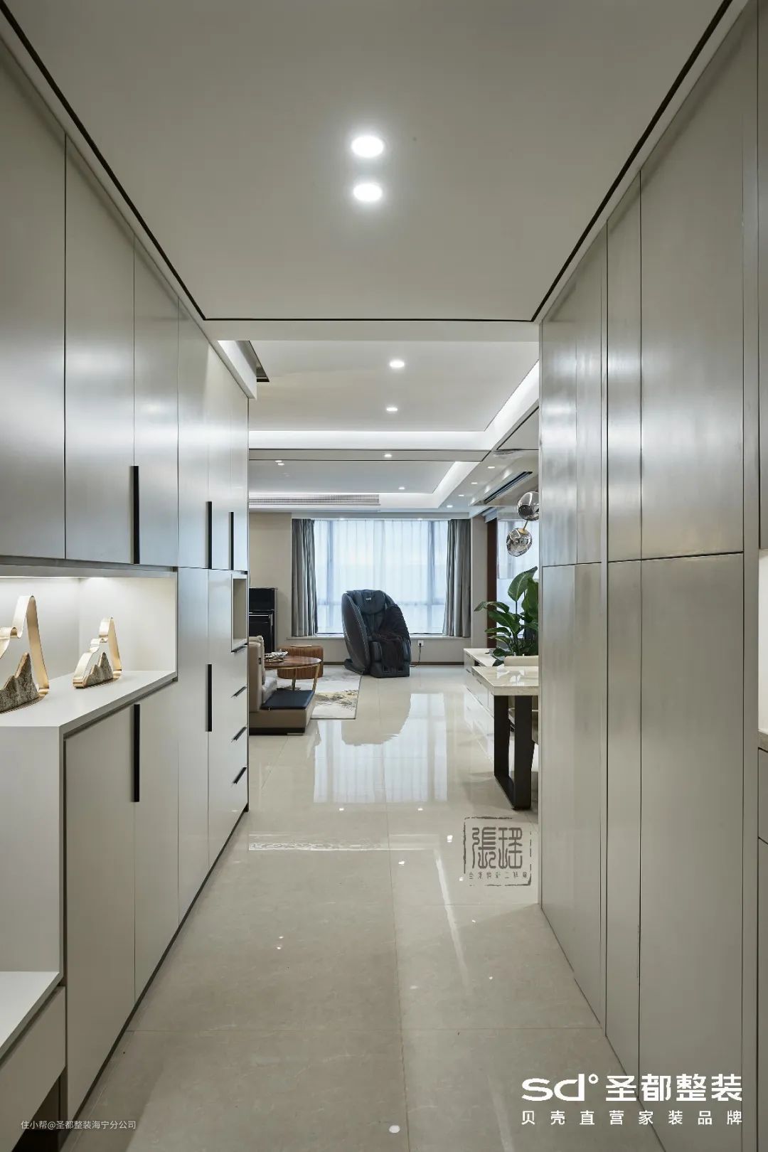 入户玄关如果是一条长长的走道,可以沿着墙壁定制顶天立地式收纳柜。不过最好选用白色系,这样不显压抑。