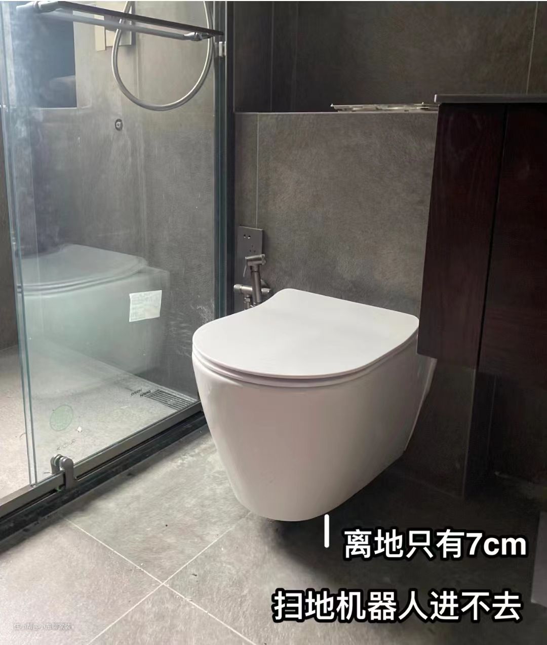 悬挂式马桶大翻车,欲哭无泪啊,装修每一天都在妥协,我选悬挂式马桶就是为了好打理卫生和好看,可验收一看,马桶离地才7cm,任何扫地机器人都进不去,已经失去悬挂式的意义了,不如买个正常马桶了,价还贵。