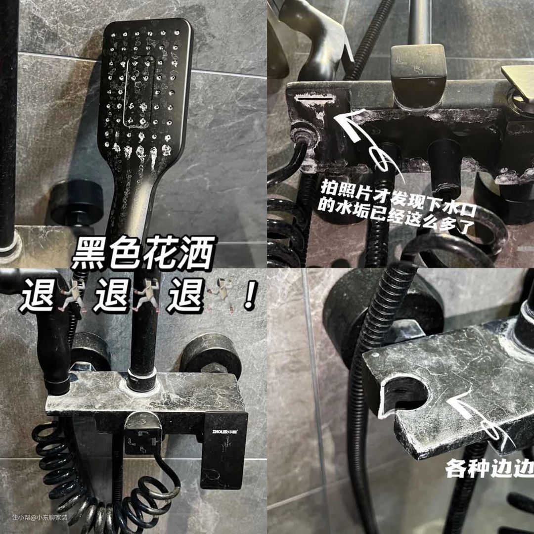 咱就是说别买黑色花洒了,水垢水渍简直顽固到想哭,最初为了高级感选了黑色花洒,刚装上确实高级,现在真实清理到想哭,我家这边水质硬,干了之后一片白。