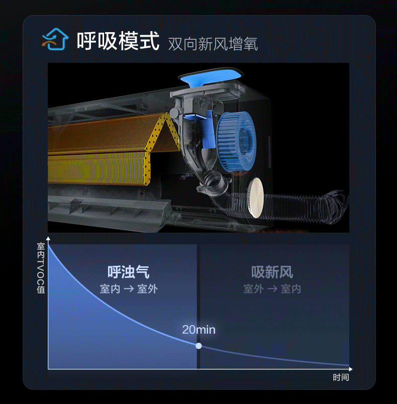而TCL新风空调小蓝翼III,是采用双向换新风技术。可以实现60m³/h的大新风量,30m³/h的排气量,先排后吸实现室内焕新空气,双向换新风,迅速换新室内空气,增加室内氧气含量。