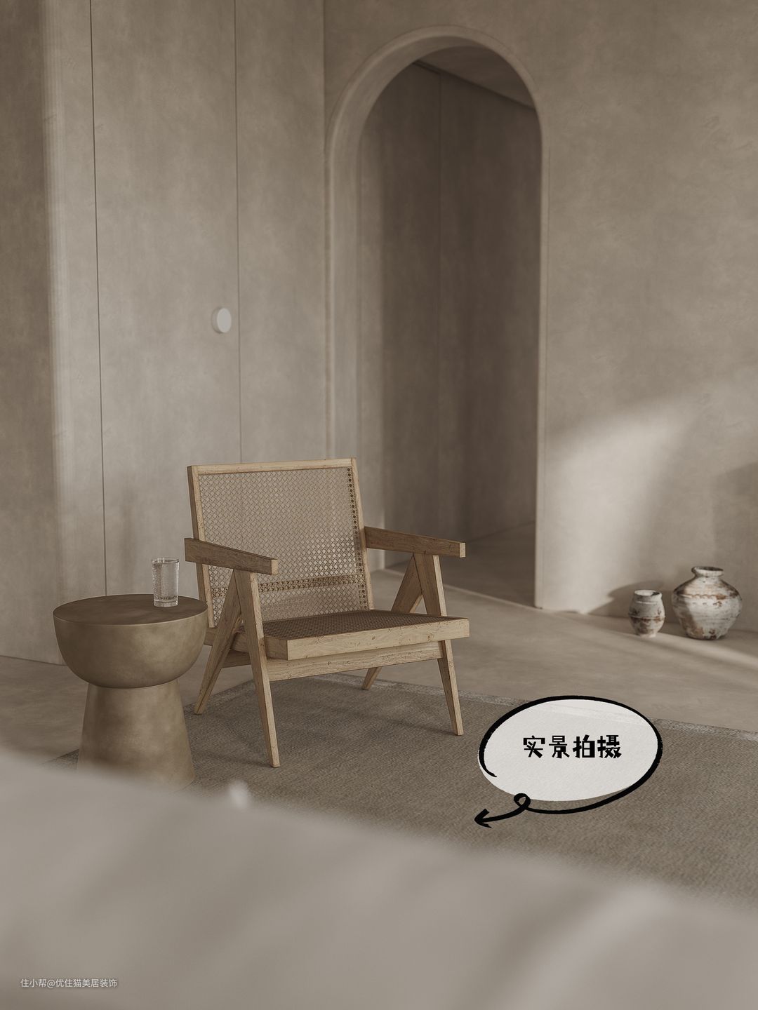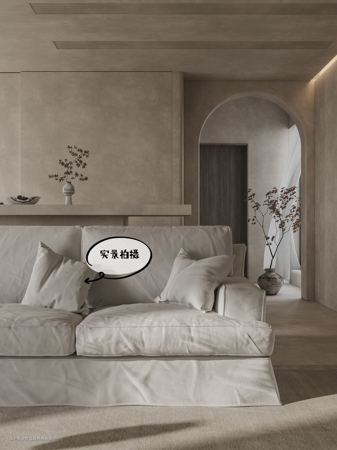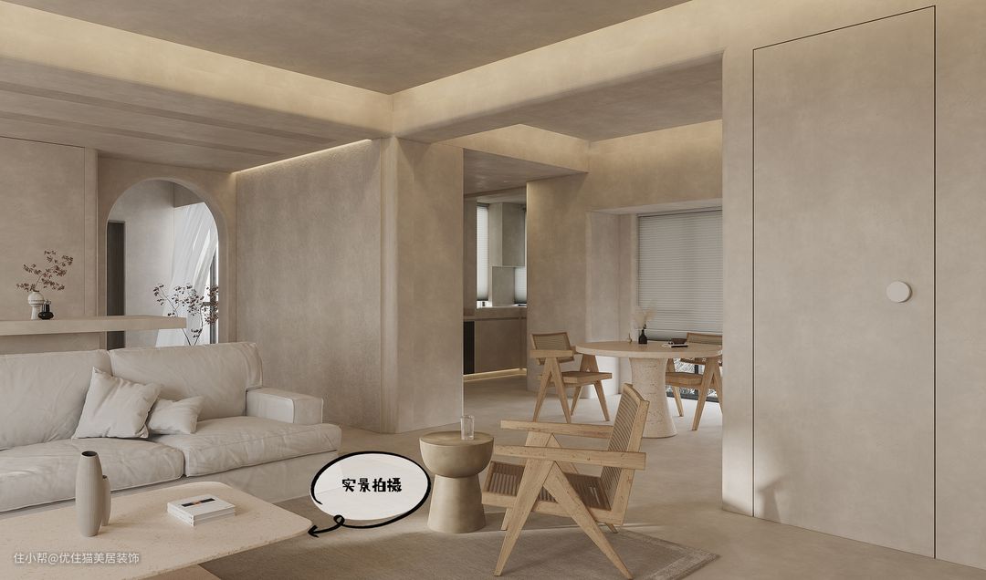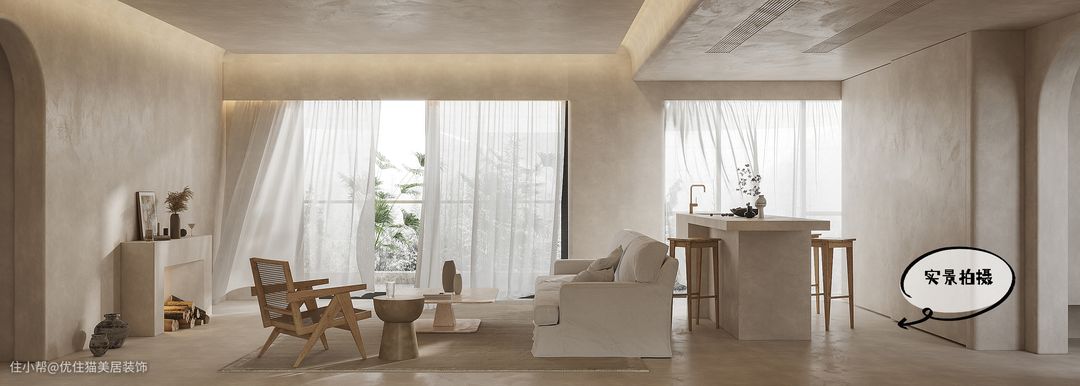 无论家居还是禅宗,都讲究“形意结合”,侘寂风的“形”更偏向钝感,常见弧形线条和圆角设计,最具代表性的是拱门和壁龛,优雅圆润的线条更具美感,同时还原了置身于洞穴的原始感。