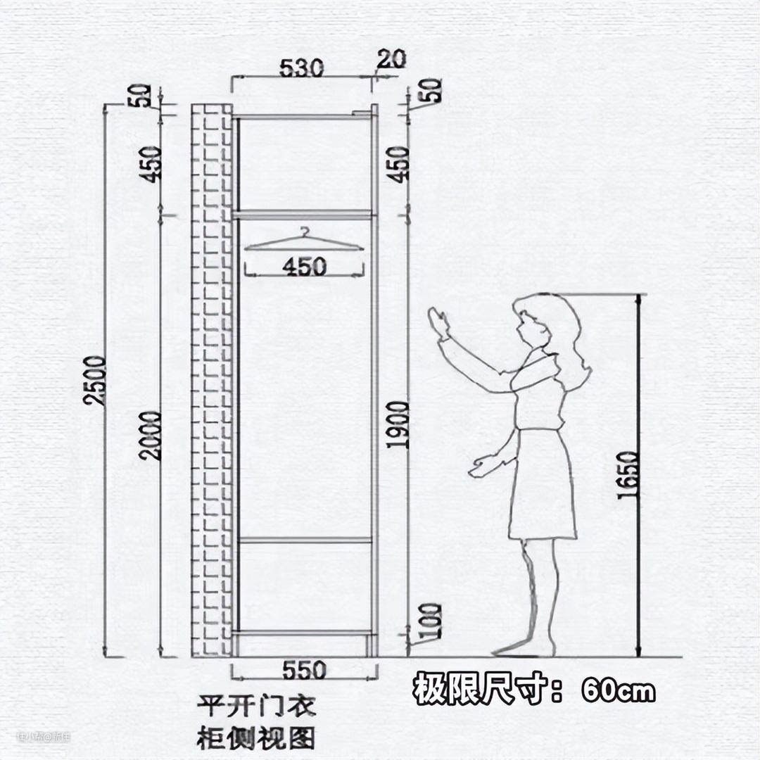 衣柜的极限深度是55cm,这个尺寸基本上家里有大个子男生,衣服就得关门的时候稍微斜一下了,标准的深度是60cm。