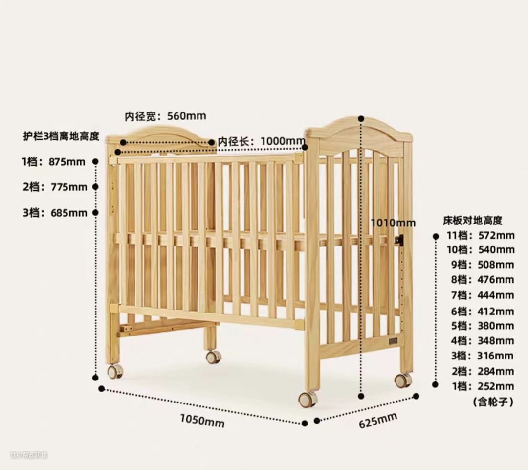 婴儿床,外径的宽度最小是在63cm左右,才能确保床的净尺寸能达到60左右。
