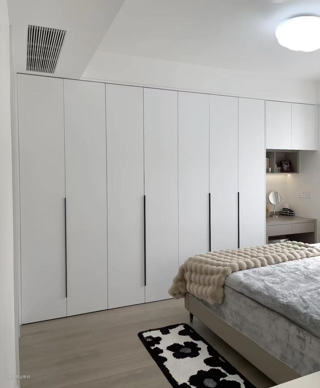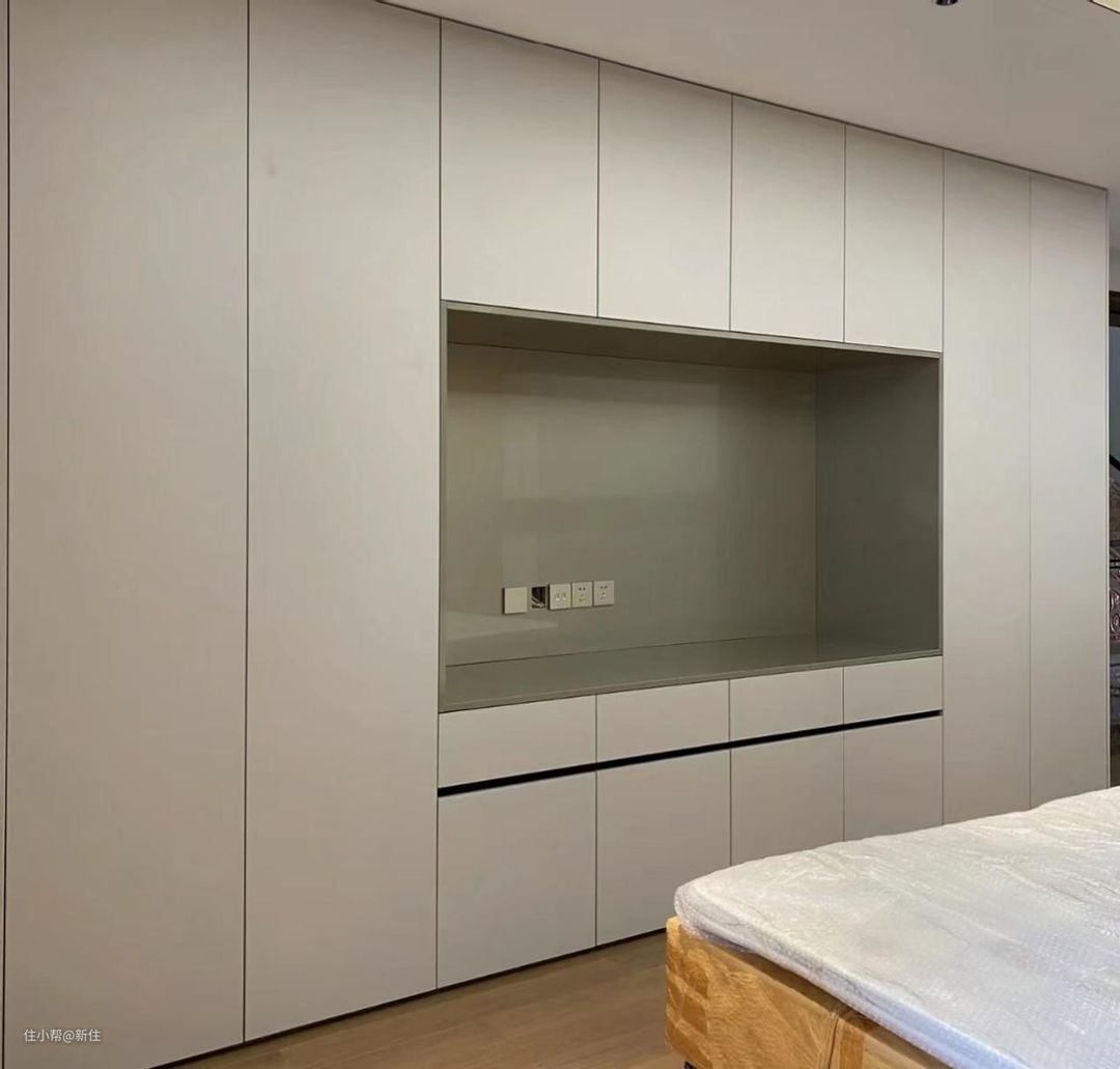大多数卧室,床跟窗户平行之后,床尾的长度,都远超过床侧面,3米起步,用作衣柜绰绰有余,甚至还能留出80cm+去做梳妆台。