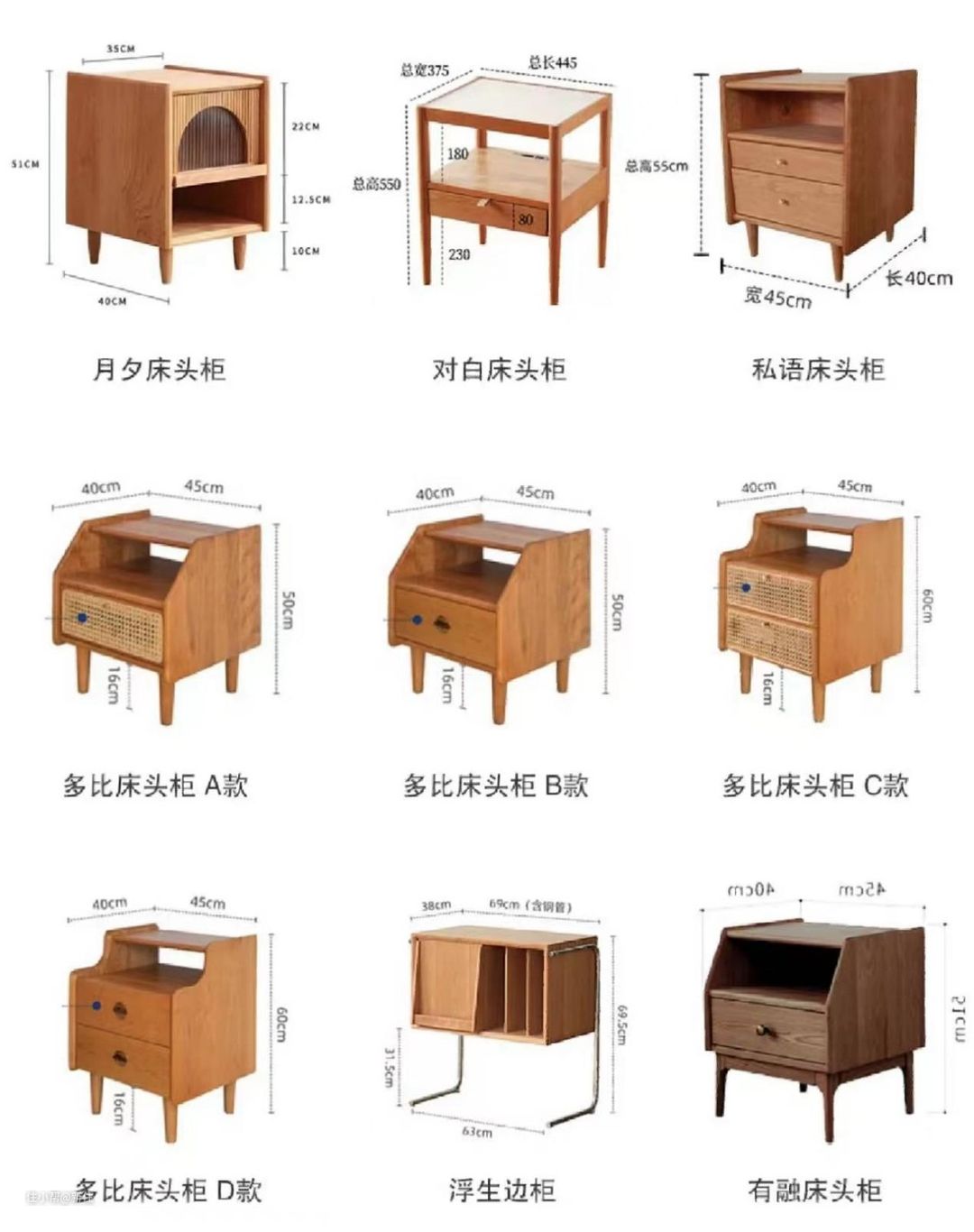 极限尺寸有30cm宽的,大多数床头柜的尺寸都是45cm宽,45cm深,大一点的也有到60、70cm的。