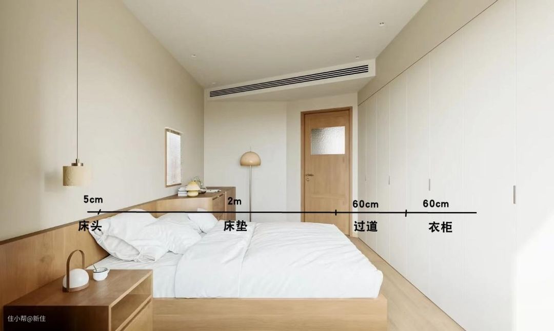 不过,也不是所有卧室都能实现如此布局,因为要得这样布局,要求卧室的面宽,粉刷完之后至少要≥3.2m。
