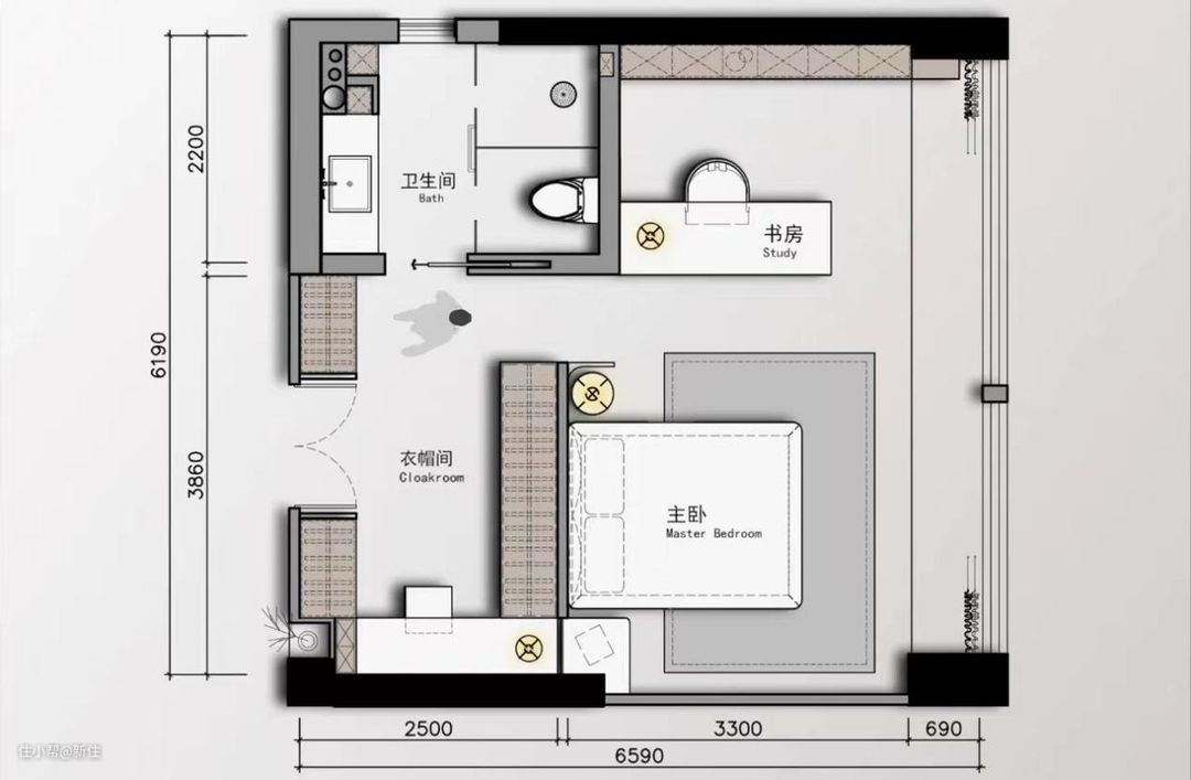床和衣柜作为卧室最占地方的两个家具,也是卧室布局的核心,讲清楚它俩,其他的物件怎么布局自然也就清楚了。
