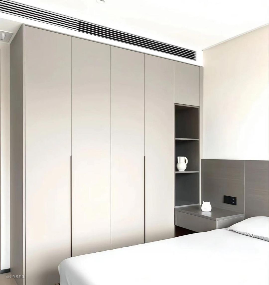 可更多家庭的卧室,床边的墙壁不够长、床边的宽度也不足,所以就面临着:衣柜不够用以及柜门和床头柜打架的现状。