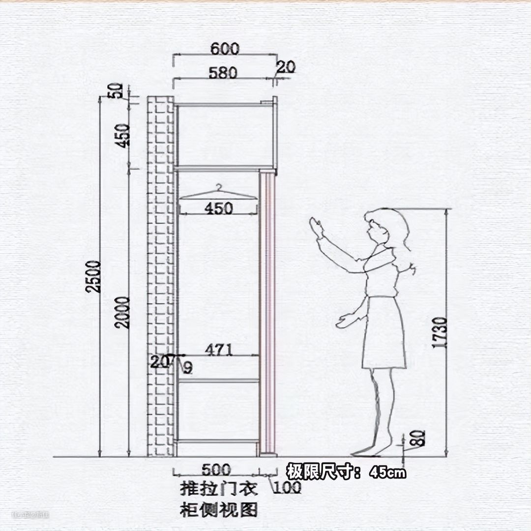 此外,单扇柜门的尺寸一般在40cm左右,也就是说,要想人在衣柜前轻松拿衣服,就得至少预留一个60cm的过道。