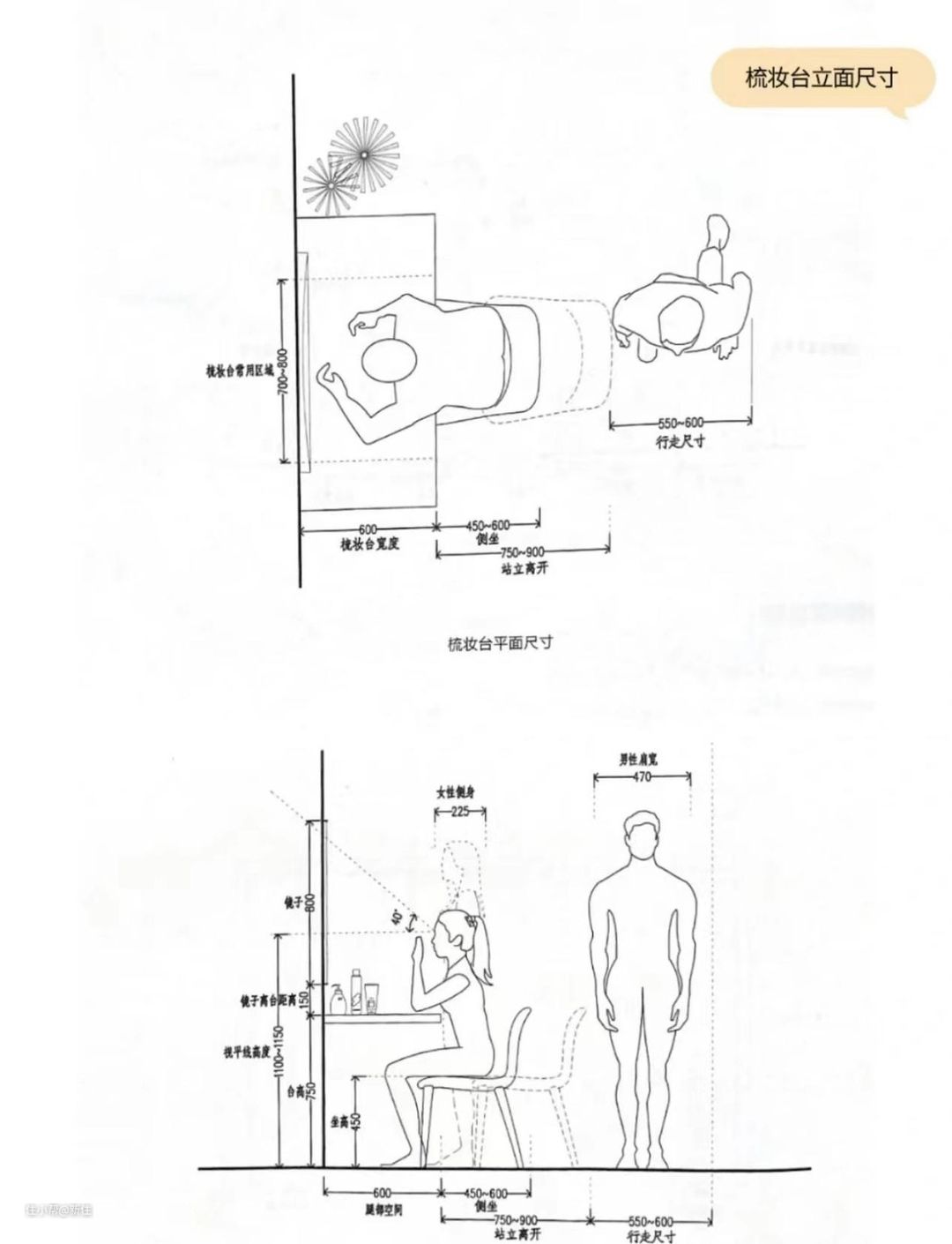 另外,梳妆台、书桌还需考虑椅子,与餐桌的通过距离一样,正常成年人落座,需占宽度45cm,站立起身转动一下椅子则至少需要60cm,想不转动椅子则需要75cm+。