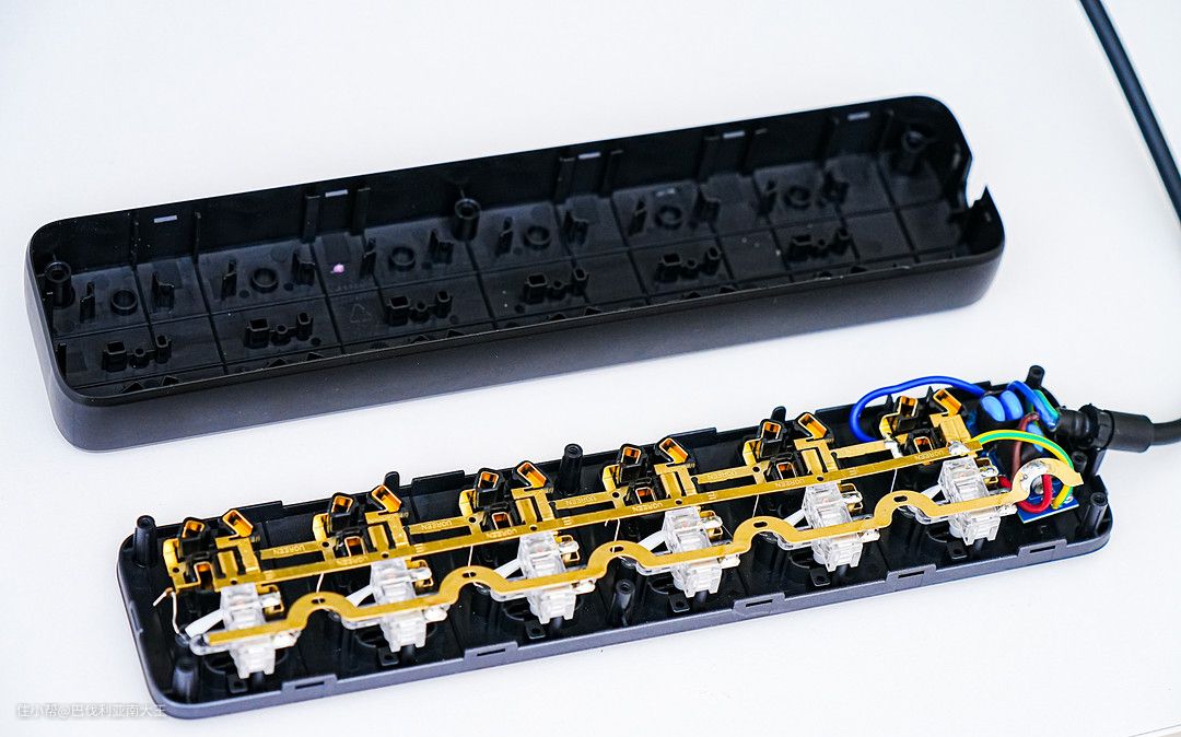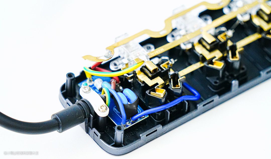 打开外壳之后,内部的结构清晰可见。插座内部为一体式铜条结构,整个排插内部线路一体成型工艺设计。每一个插座位置都配有独立的开关,官方说开关通过5000次按压测试依旧灵敏。